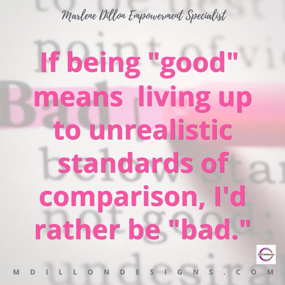 If “good” is meeting the external standard, then I give myself permission to be “bad.” I get to my own standards for what matters to me, what I prioritize, what gets my attention, and how I choose to show up in any given moment. I am done with living up to the labels. I’m done being “good.” I choose to be me, and I hope you give yourself permission to be you.