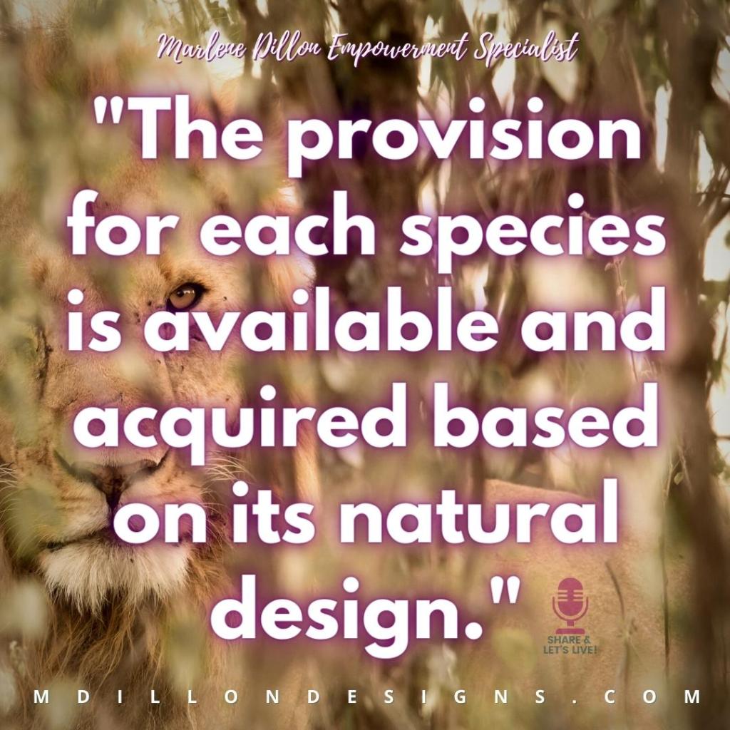 What I realized is that every species has sustenance provided. Some effort is required in attaining it, but the requirements for attaining it are aligned with the natural skills, strengths, abilities, and design of that species. Rarely does a lion just walk up and a zebra is laying there before its den waiting to be eaten. But the lion’s natural capabilities allow it to use its speed, strength, stalking, its teeth, strong paws and jaws to acquire its prey (provision). A bird has its wings, sight, keen hearing, beak and sometimes talons that allow it to seek and grip its prey (provision). The bird doesn’t have to take down a zebra to eat. That’s too hard. That’s not how it’s designed. A lion doesn’t have to fly or dig for worms in order to eat. That’s not how it’s designed. The provision for each species is available and acquired based on its natural design.