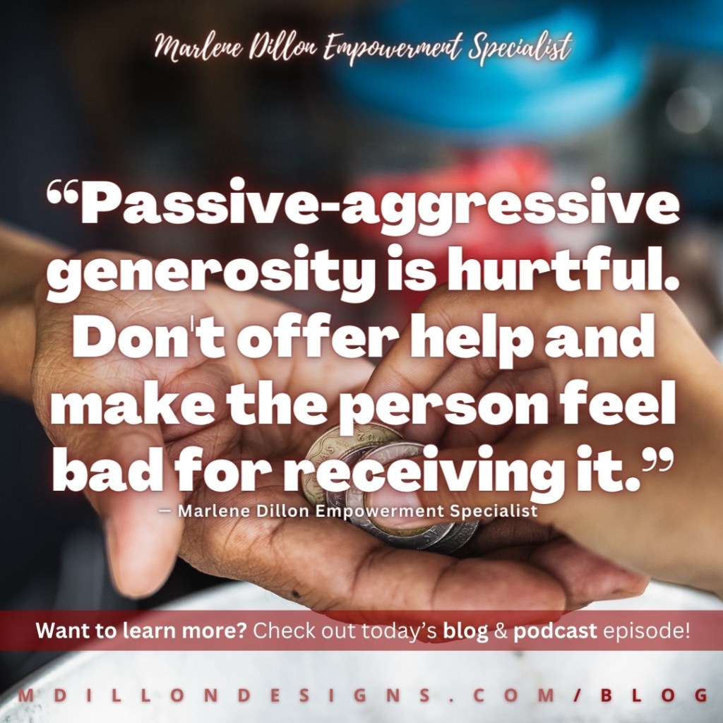 I came up with this term today as I was trying to find the words to describe what I’ve experienced. “Passive-aggressive generosity” is giving in a mean-spirited manner. It’s when a person offers support and insults the recipient while they’re giving it. It’s when a person is generous while simultaneously being hurtful and unkind. I believe this happens because at their core, they don’t really want to help the person, and it seeps out.
