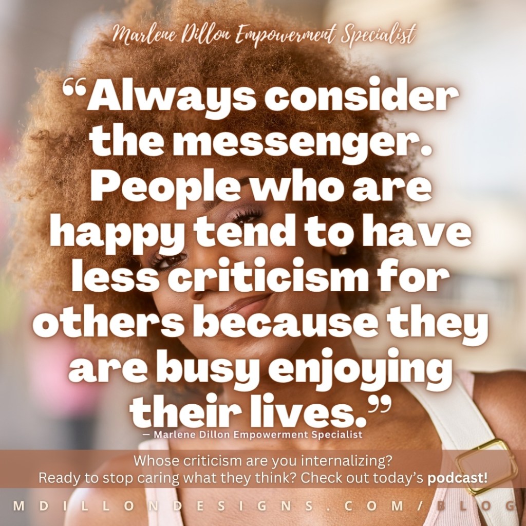 “Always consider the messenger. People who are happy tend to have less criticism for others because they are busy enjoying their lives.” — Marlene Dillon Empowerment Specialist