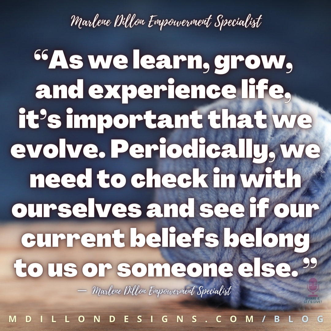 “As we learn, grow, and experience life, it’s important that we evolve. Periodically, we need to check in with ourselves and see if our current beliefs belong to us or someone else. ” — Marlene Dillon Empowerment Specialist
