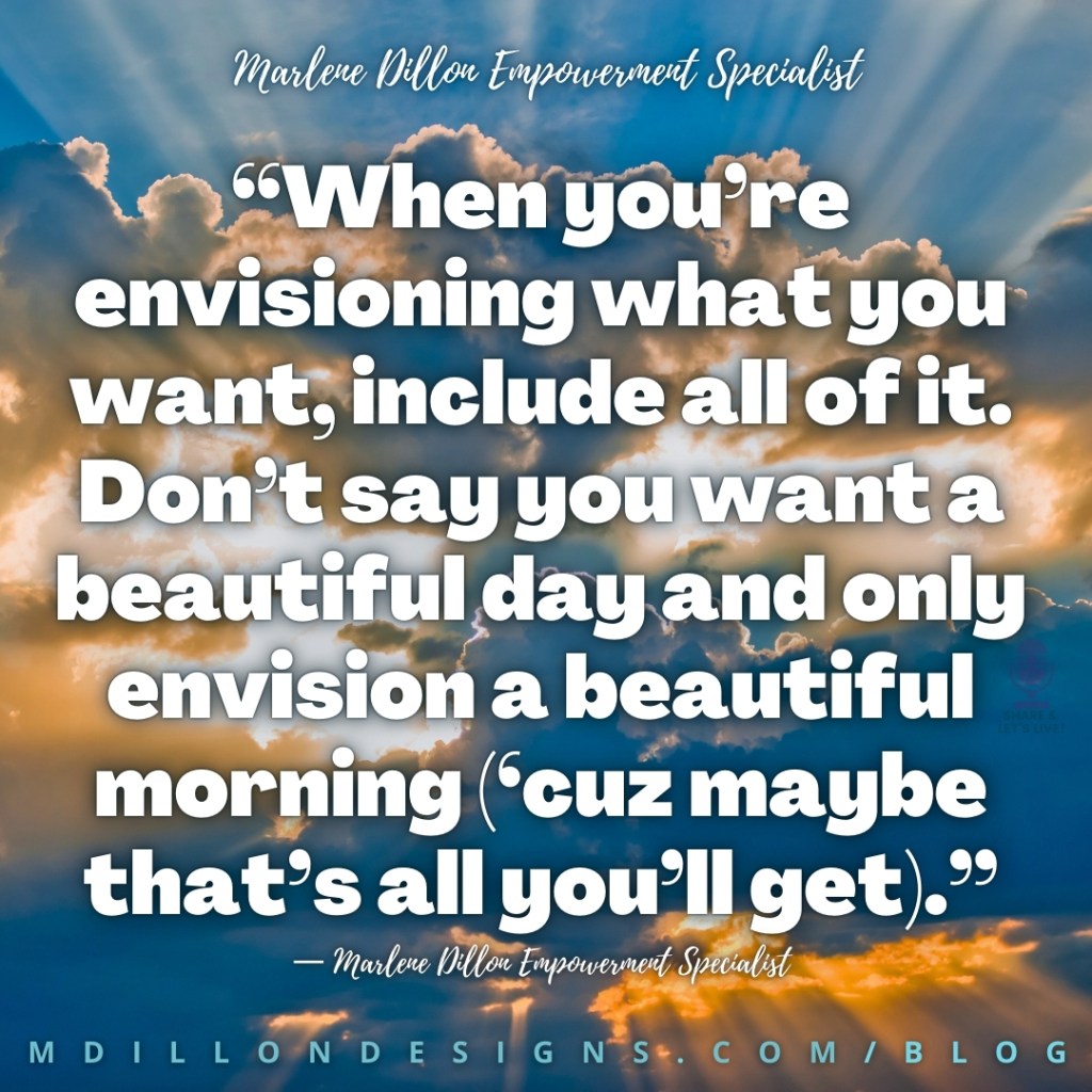 Many years ago my (late) mentor told me, “God’ll teach you a lesson in a way you won’t forget it.” And she was right. Today showed me VERY clearly, that if I want the most beautiful day, I cannot just envision a beautiful morning. I have to envision a WHOLE beautiful day from start to finish.