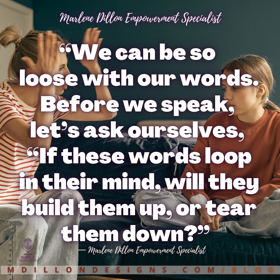 On today’s episode of Share & Let’s Live! with Marlene Dillon Empowerment Specialist, I talk about being aware of words. If you are a parent, aunt, uncle, grandparent of a child, tween, or teen…. If you are the bestie, the partner, the spouse, the friend… If you are a teacher, administrator, supervisor, doctor…. pay attention to the words you speak.