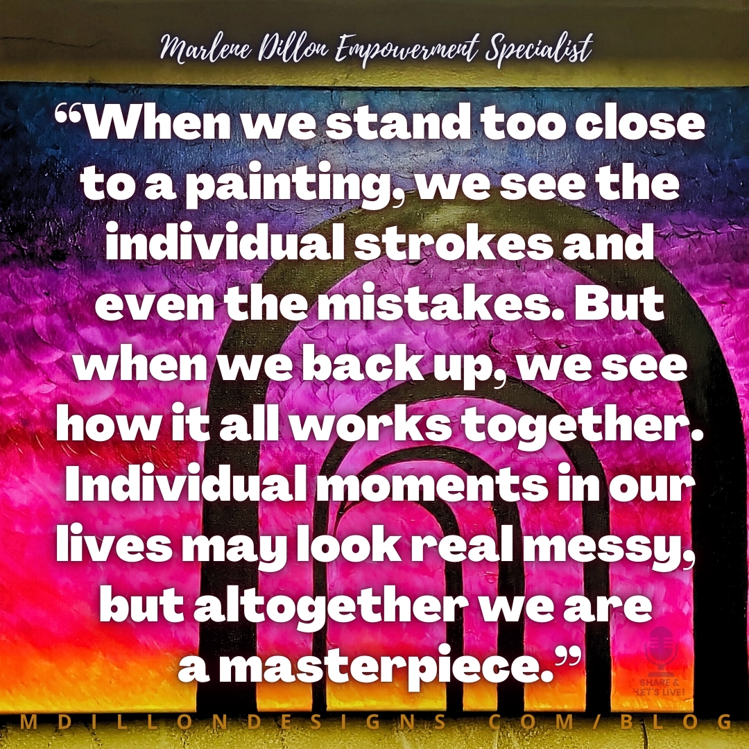Looking back, I now see that my life is not just a timeline of bullsh*t. That these moments are individual splashes of paint on the canvas. As I step back and look at the totality of my life, I realize that these messy experiences have all been parts of a grand masterpiece. And I’m still in it. My life is still being painted, because I’m still here.