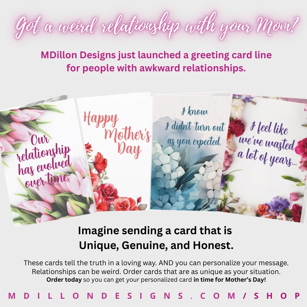 My whole life, Mother’s Day card shopping has been a dreaded and excruciating process, because none of the cards in stores in the least bit relate to the relationship I have with my mother. So after last year’s painful experience that turned into a blog post and podcast, I mentioned to a dear friend that I had been thinking about creating my own line. And she was ecstatic about it. I had no idea she’d been suffering in silence and had the same relationship with her mother.