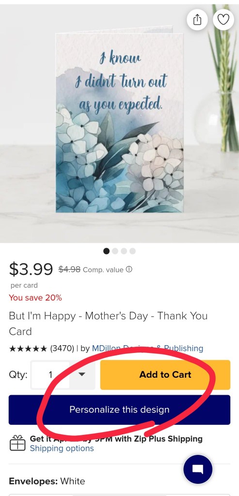 Here’s the link to my collection: https://www.zazzle.com/collections/mothers_day-119336705061807333 Just an FYI, these are actual physical, printed cards like you would buy in a store (except better because they are unique, genuine, honest AND customizable). Keep checking back, as I get inspirations randomly and you may look and find throw pillows next time. 😂