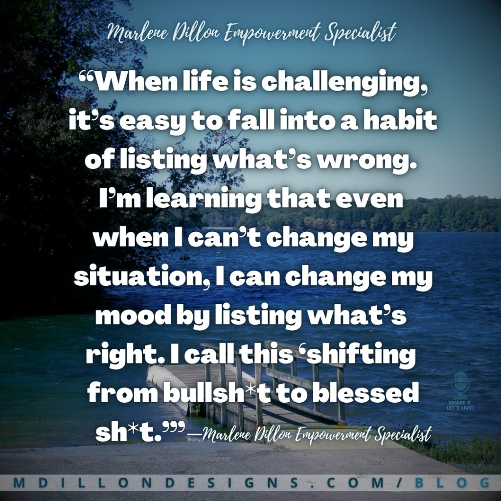 “When life is challenging, it’s easy to fall into a habit of listing what’s wrong. I’m learning that even when I can’t change my situation, I can change my mood by listing what’s right. I call this ‘shifting from bullsh*t to blessed sh*t.’” —Marlene Dillon Empowerment Specialist