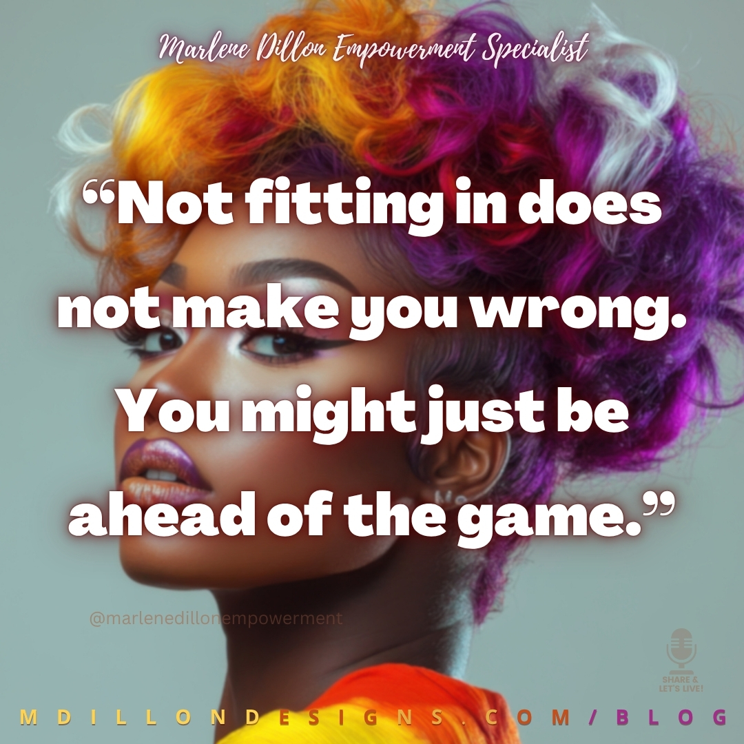 Stunning woman with colorful hair and makeup (shades of orange, pink, purple perfectly blended) Text states: " “Not fitting in does not make you wrong. You might just be ahead of the game.”