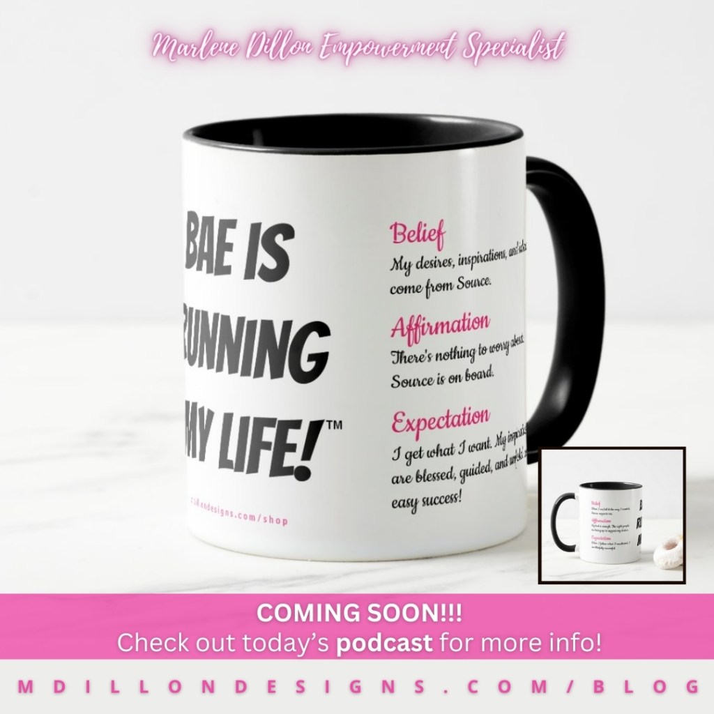 A really cool thing that I decided today is that I’m going to be creating BAE merch! I love to have practical ways to keep new practices in front of me. So I will be designing some items (coffee mugs, travel mugs, tees possibly, etc.) displaying various phrases like, “BAE is running my life.” The mugs in particular will be customizable, allowing you to write your own new belief, affirmation, and expectation and it will be printed directly on your mug!